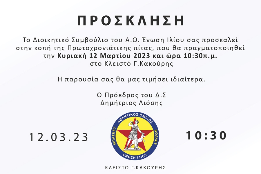 Ο ΑΟ ΕΝΩΣΗ ΙΛΙΟΥ σας προσκαλεί στην κοπή της πρωτοχρονιάτικης πίτας του που θα πραγματοποιηθεί την Κυριακή 12 Μαρτίου 2023  και ώρα 10:30 στον χώρο του Κλειστού Γυμναστηρίου Γ.Κακούρης.