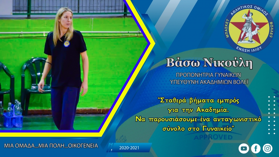 «Φέτος αν και η χρονιά δεν ολοκληρώθηκε, καταφέραμε να σημειώσουμε μια σημαντική επιτυχία στην Ακαδημία μας. Οι Κορασίδες του συλλόγου μας κατέκτησαν επάξια την θέση της ανόδου στην Β΄Κατηγορία, καθώς μέχρι και την διακοπή του πρωταθλήματος και την μη διεξαγωγή του F4 λόγω του Covid-19, ήταν η καλύτερη ομάδα της κατηγορίας από στατιστικής πλευράς, με μόλις μια ήττα σε 18 αναμετρήσεις και σετ 52-5. Αυτή η επιτυχία φυσικά και έχει πρόσωπο και δεν είναι άλλο από την προπονήτρια μας και πολύ καλή μου φίλη Δήμητρα Γιακουμή για την οποία είμαι περήφανη που έχει επιλέξει να εισέλθει στον τομέα της προπονητικής και με τις γνώσεις και την εμπειρία της καταφέρνει να δίνει στα κορίτσια αυτό που και η ίδια είχε ως αθλήτρια. Σκληρή δουλειά, πνεύμα μαχητικό και να κοιτούν ψηλά κάνοντας σωστό πρωταθλητισμό.